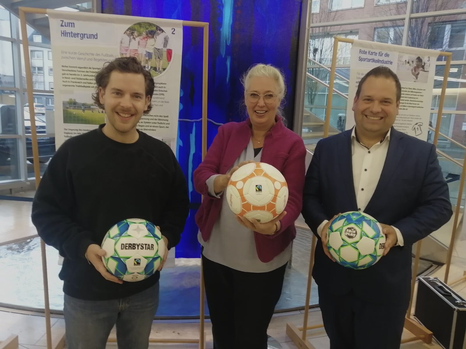 Die Ausstellung zeigt auf sieben Bannern die verbindende Kraft des Fußballs und macht gleichzeitig auf die problematischen Bedingungen hinter den Produktionsabläufen von Sportzubehör aufmerksam. Bis zum 17. Dezember kann sie noch im Foyer des Rathauses an der Volke angesehen werden.